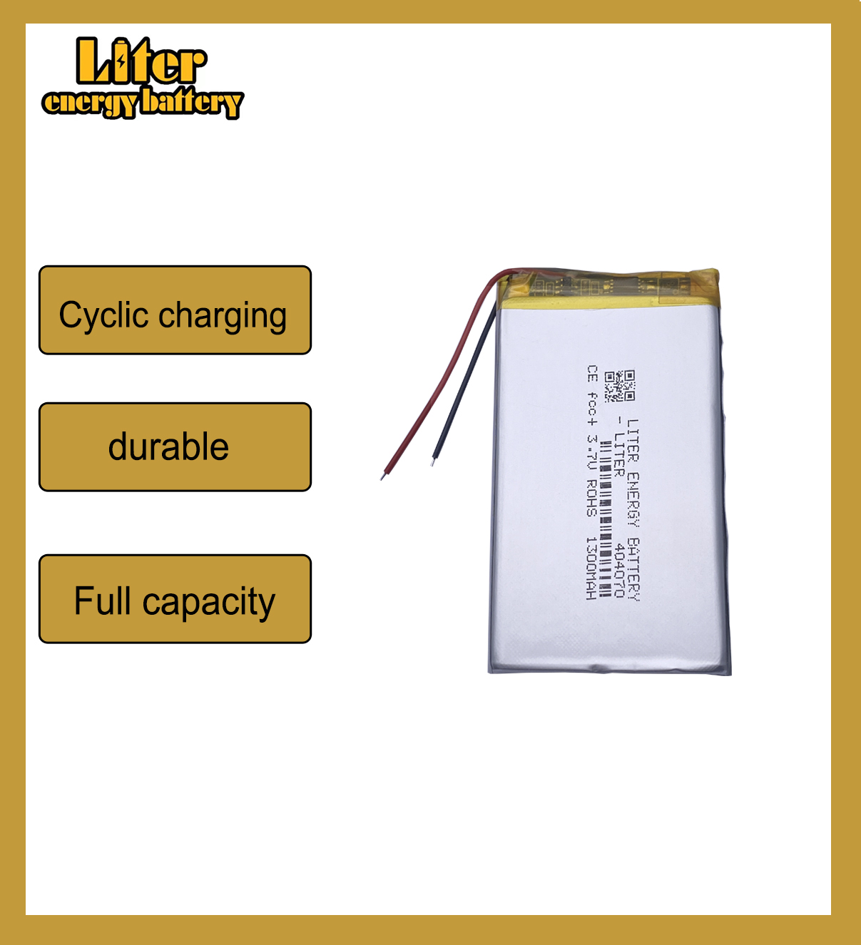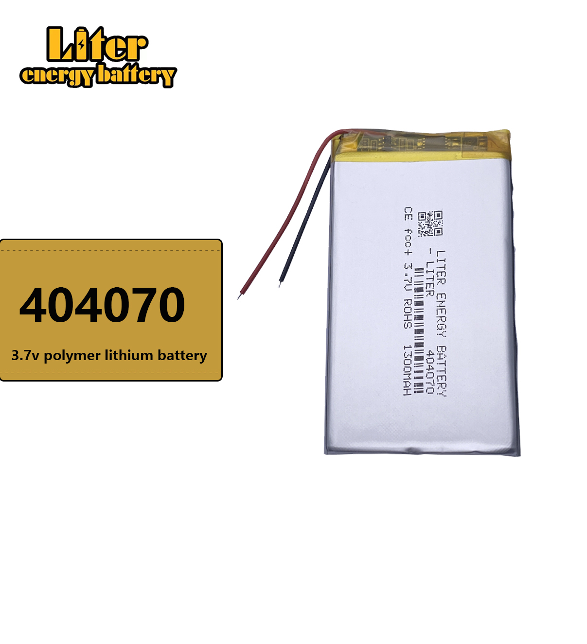 Premium 3.7V, 1300mAh 404070 rechargeable Li-Po battery.