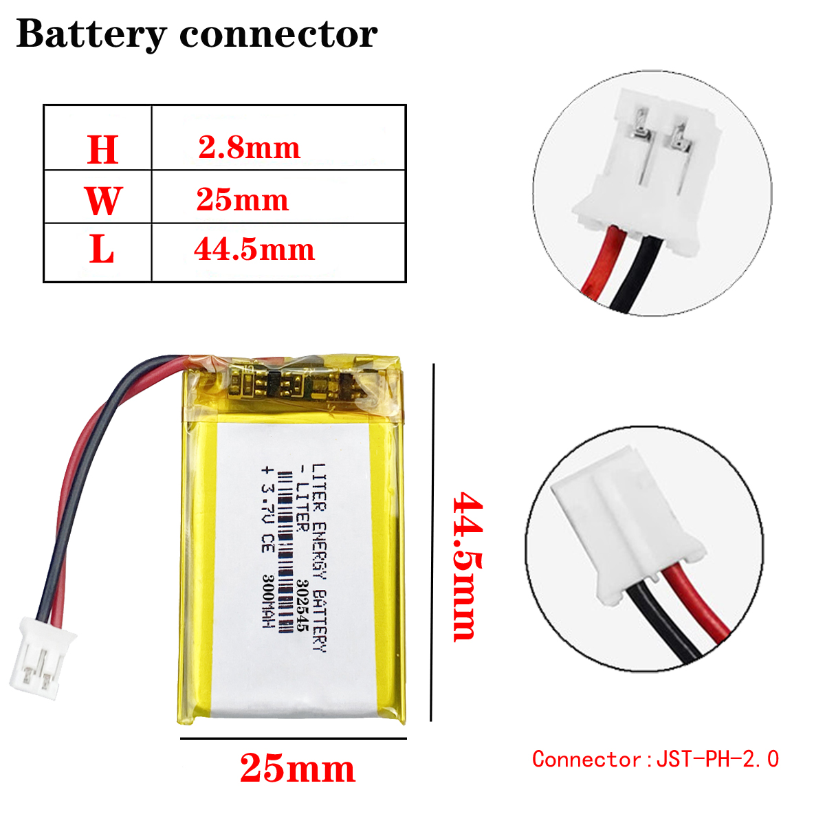 3.7V Lipo 302545 302547 300mAh Small Rechargeable Li-polymer Battery with PH2.0mm connector