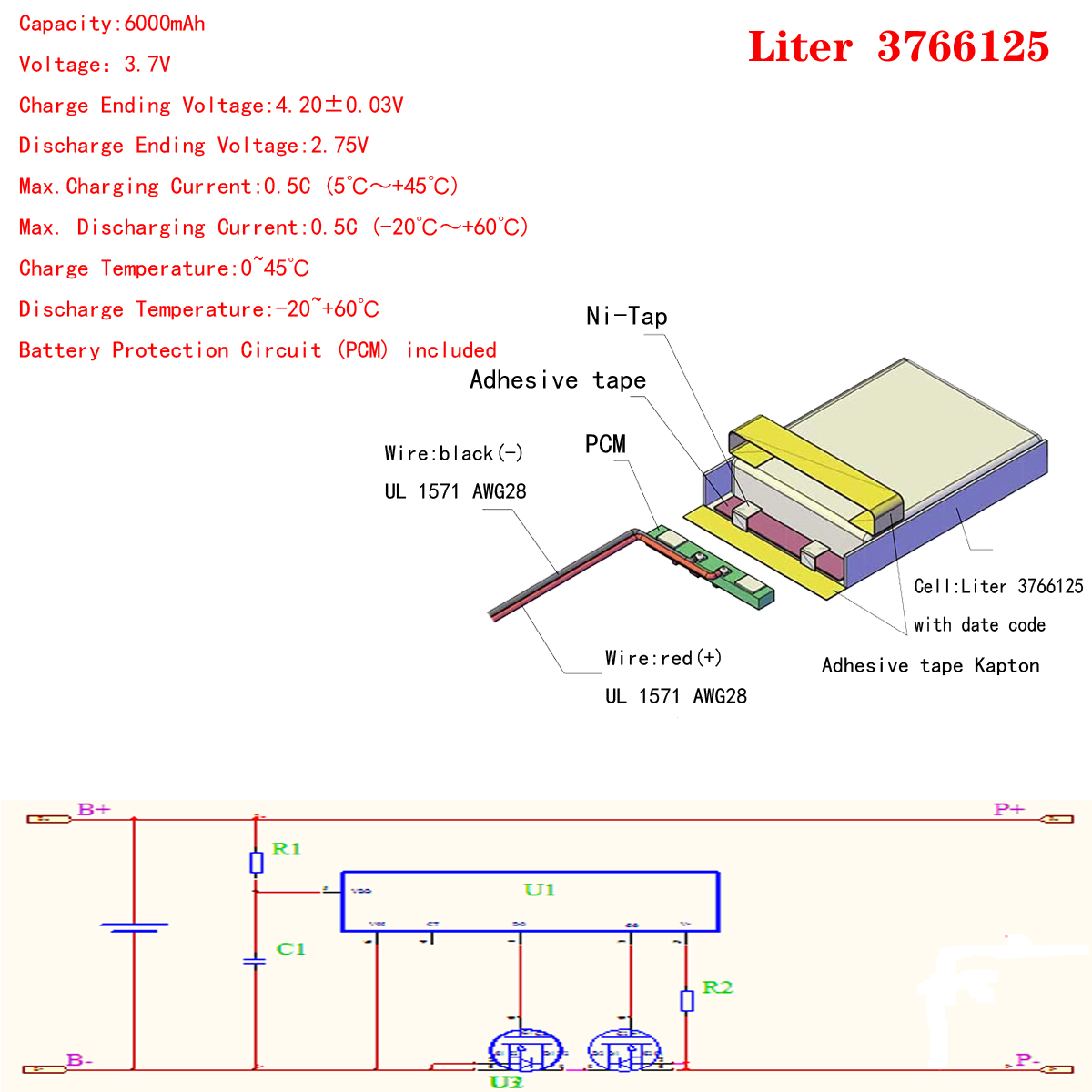 Mini 3766125 3.7V, 6000mAh rechargeable Li-Po battery.
