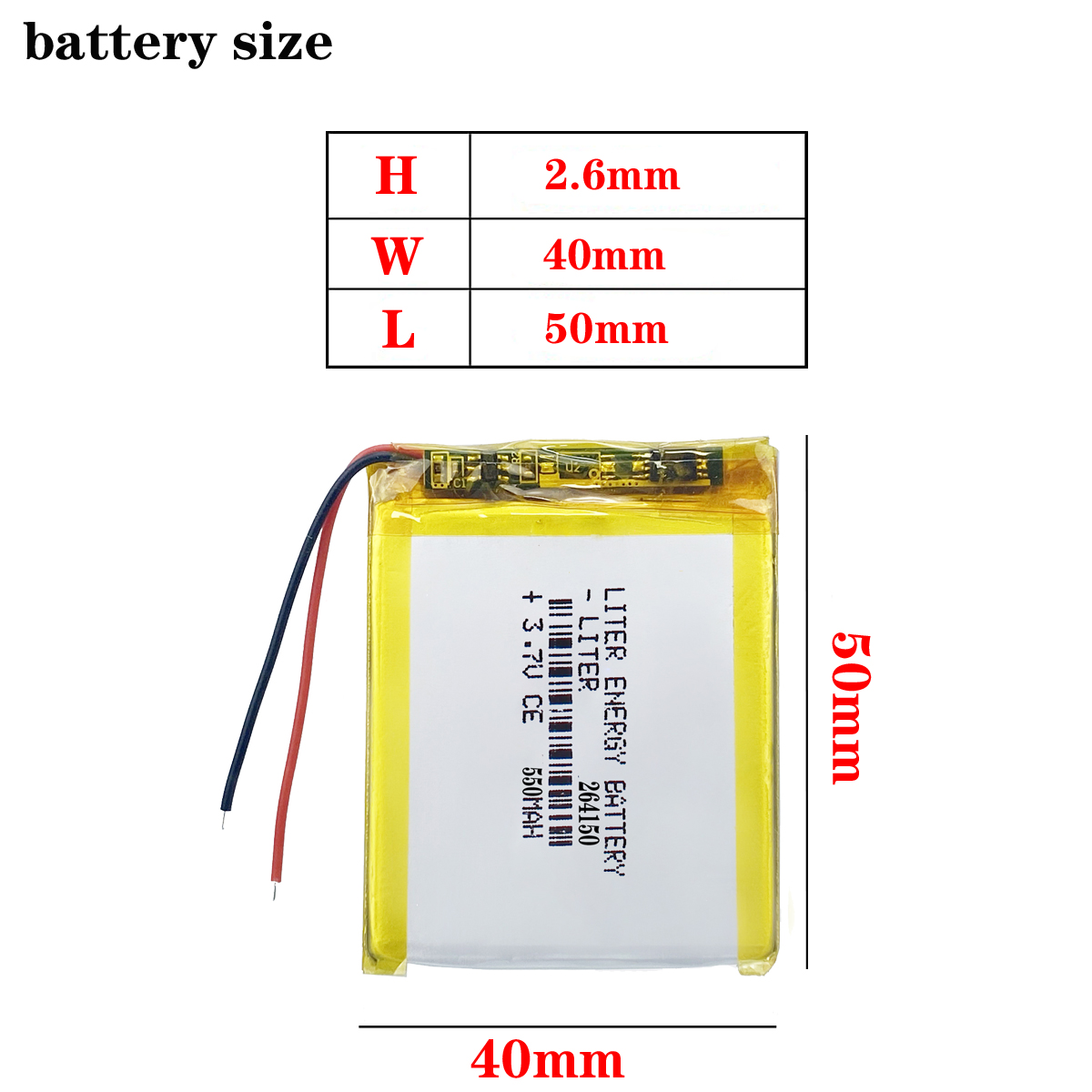 Mini 264150 3.7V, 550mAh rechargeable Li-Po battery.