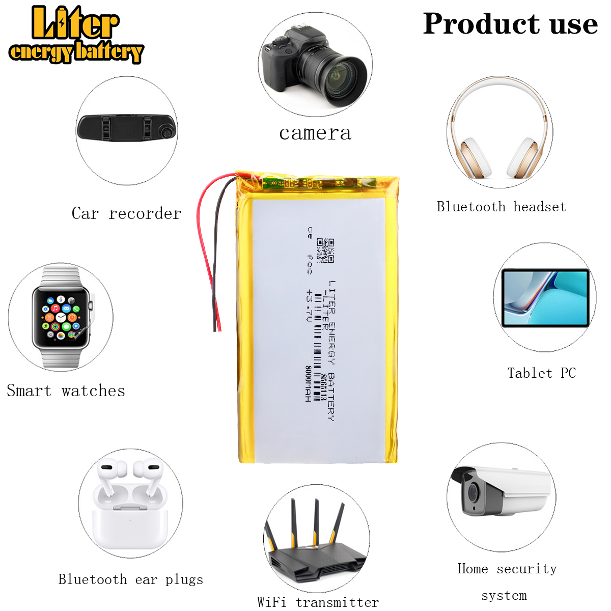 Widely used for GPS, tablet, vehicle traveling data recorder, E-book, portable printer, DVD, power bank, MID, PAD, PDA, , POS machine, digital camera, LED lamp, electric toys, monitoring & medical equipment or other compatible devices powered by batteries with the same size and capacity.